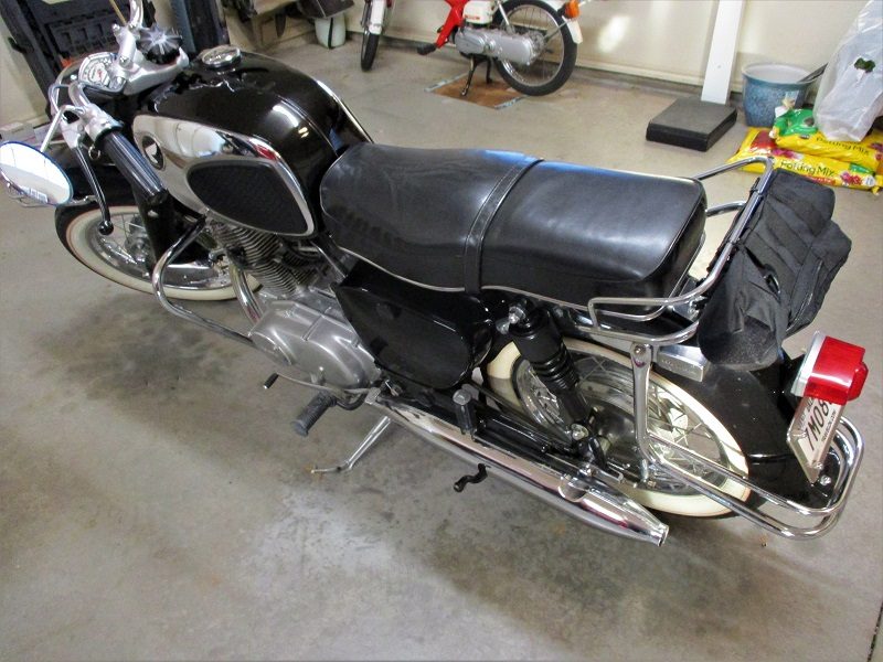 The original seat has been stored away for many years, to nice to ride on. So, I placed a solo seat, a luggage rack fabbed out of one off a trail 90, a '68 Buco windscreen, and a set of '68 Wixom Ranger saddlebags.