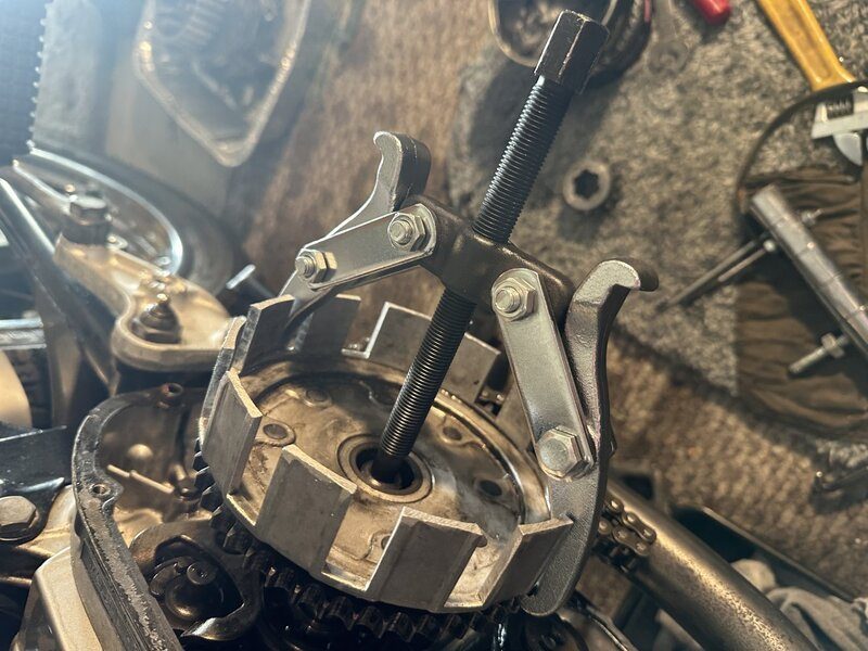 Easier said than done, a standard 6" puller doesn't quite get a purchase on the outer rim of the clutch basket with the drive chain in place, however it did look as if it would work if the chain was removed.