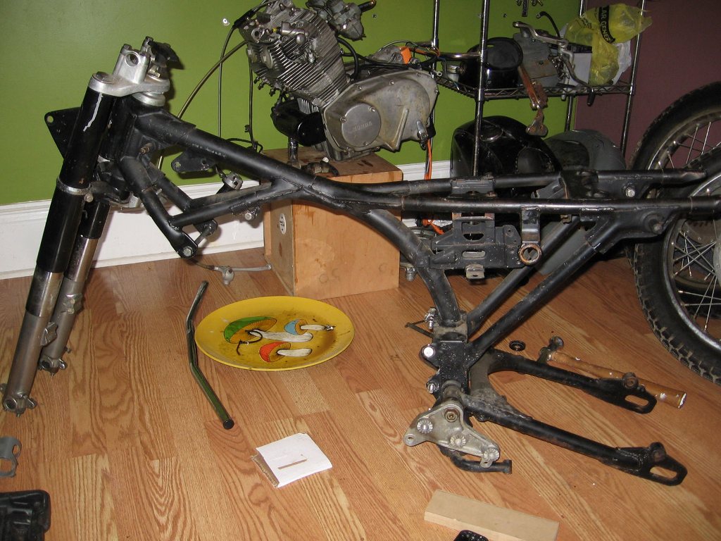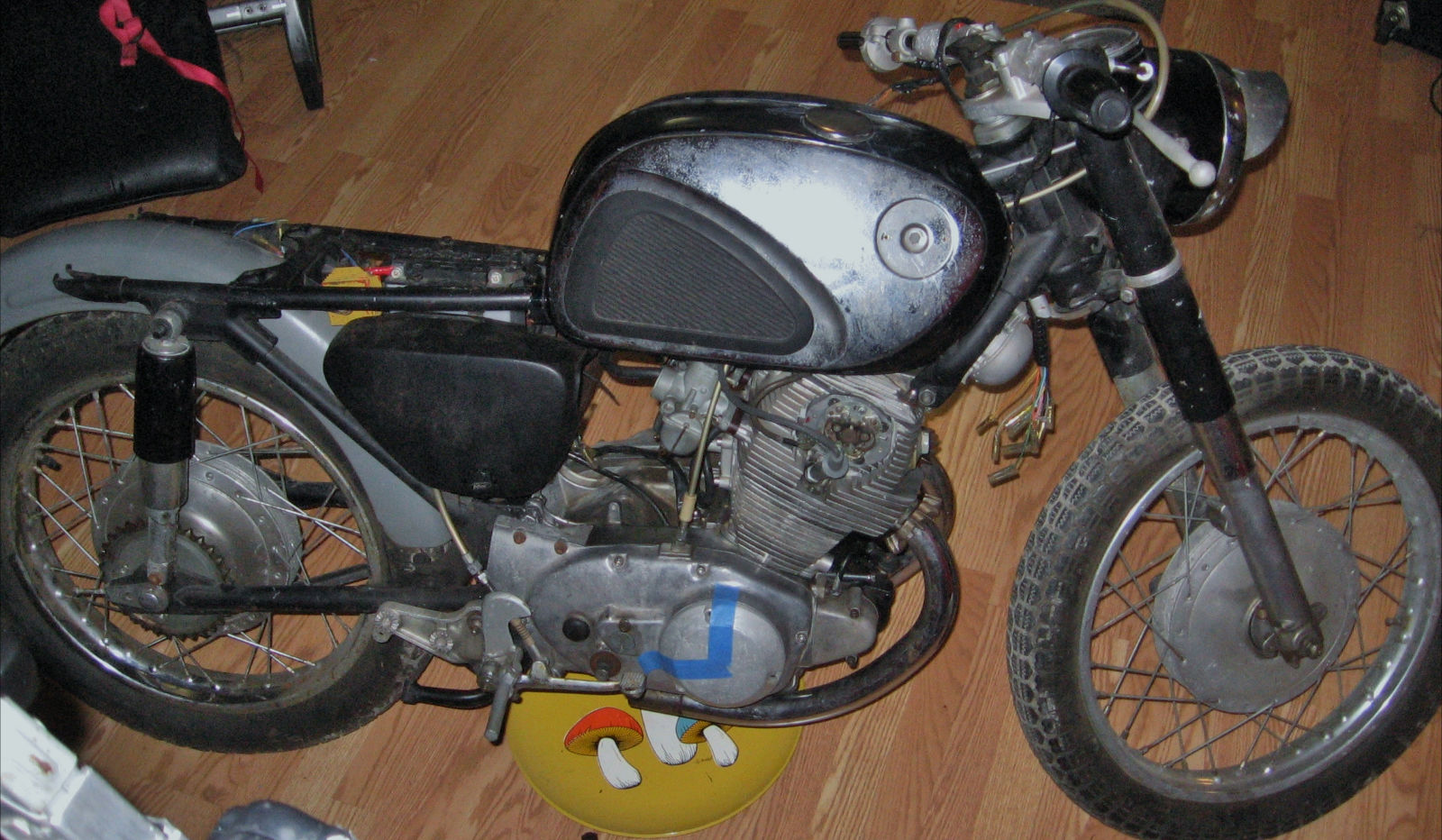 An acquaintance had it in a warehouse shop that parted out bikes and gave it to me as in the picture about 4 years ago. I was going through a bad time with my now ex wife and knew it would probably be a good source of therepy further down the road. boy was I right. Its mostly complete, but it was basically being scavenged for nuts and bolts from other guys at the shop that needed parts for their projects. Its missing alot of wierd stuff like brake torsion bar bolt and all the brake linkage nuts and bolts along with the seat and all the mounting hardware for the seat, pegs, mufflers, 1 rear shock and a bunch of misc. parts. Now that it runs, its home and getting ready to be cleaned up, frame repainted, engine and metals polished and put back together. Im making a list of all parts that need replaced and will be searching for everything over the winter. Im going to keep it mainly stock and try improving the charging system and looking for LED alternatives for lights and such. Not an engine guy so that will come next year when i have it ready to go. It sounds pretty good though. I also have an old honda dream that runs but it needs a fuul blown restore. Sorry for the rambling. Any info you might have would help.