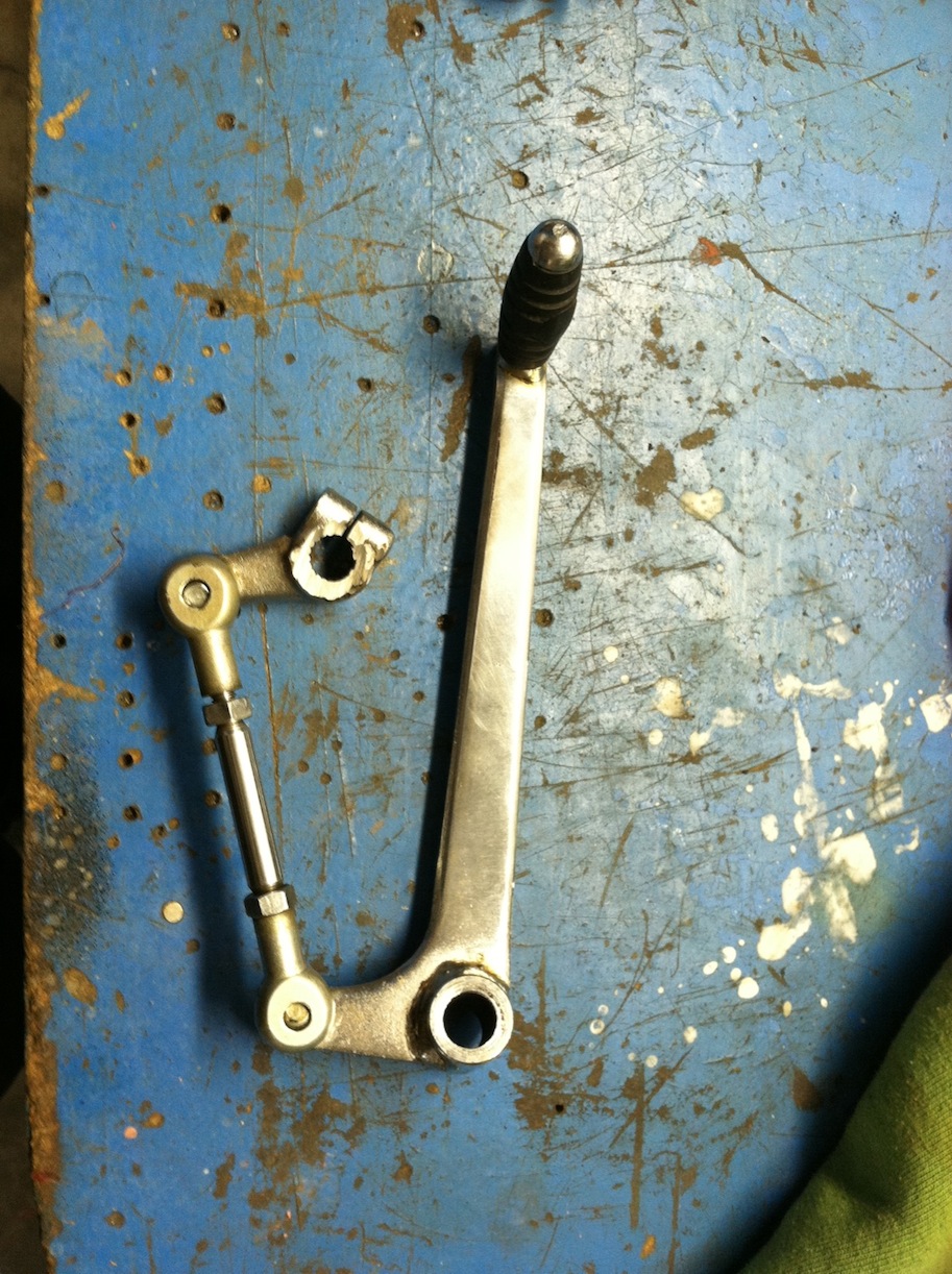 Looks an awful lot like the CYB shifter, hard to tell from pics. I have one, and I had my machinist make a bushing for it to work with the stock mount bolt. The rod ends are universals, and someone may have made the rod, easy to do. Is the I.D. correct on the shifter for the stock mount bolt?