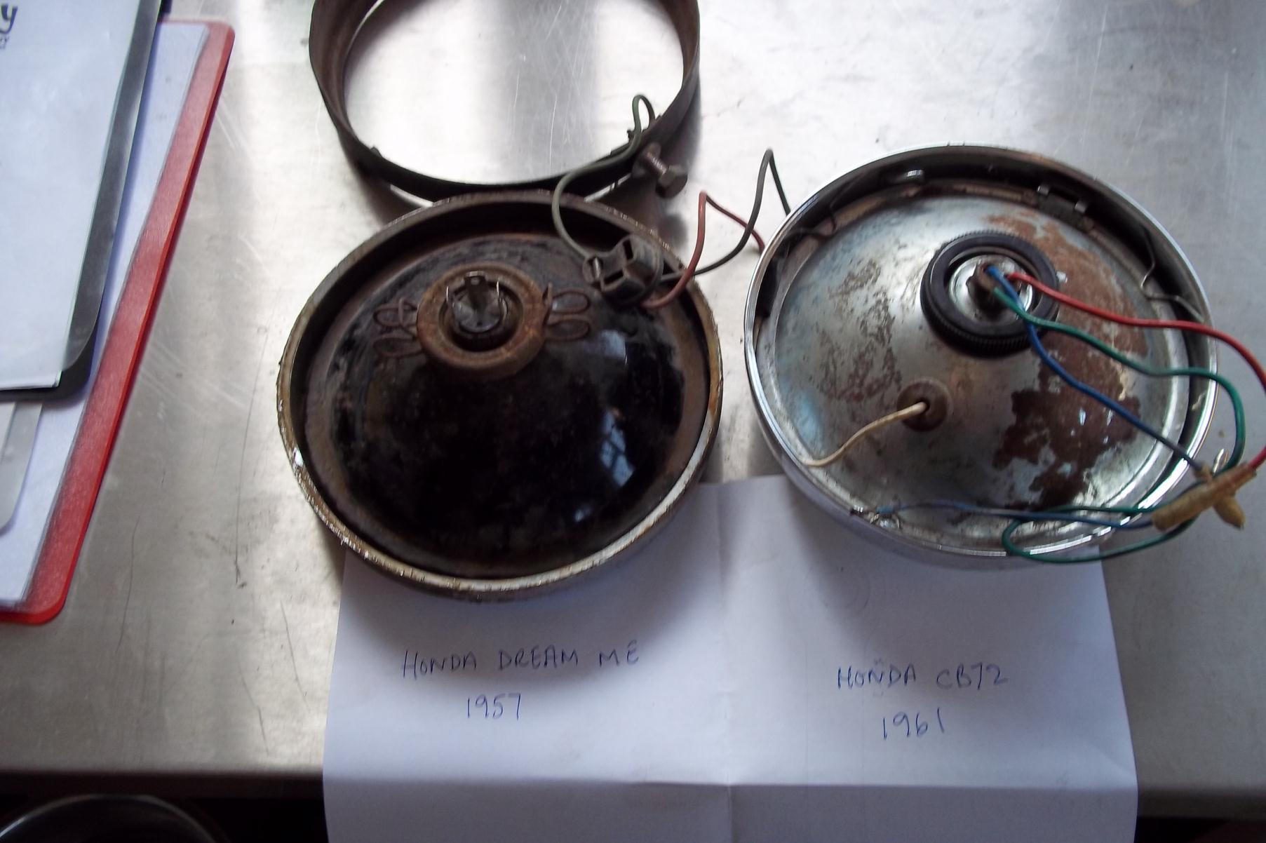 hi all.my honda m e had the headlamp bulb blown, and have been looking for one world wide, no luck, its a 3 pin fixing 6v 25/25, i have found 6v 25/25 but they have 2 contact points, so looking round, to see whats about, i took the headlamp off my cb72 1961, which has the 2 point conection, but which fits into a holder, i tryed that holder into the headlanp of the early dream and it fits, i can now take the 12v bulb from the cb72 out and replace it with the 6v 25/25 ones i have.will post a pic of the parts. alan