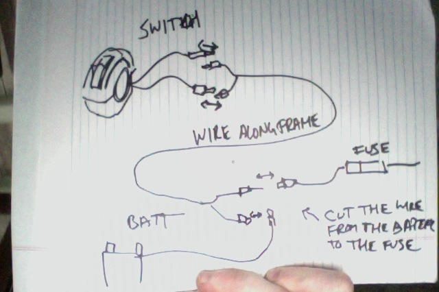 Its pretty simple, you need to run a two wire cable from the switch, through the bars, down the headstock and under the tank along the frame to the fuse behind the battery.