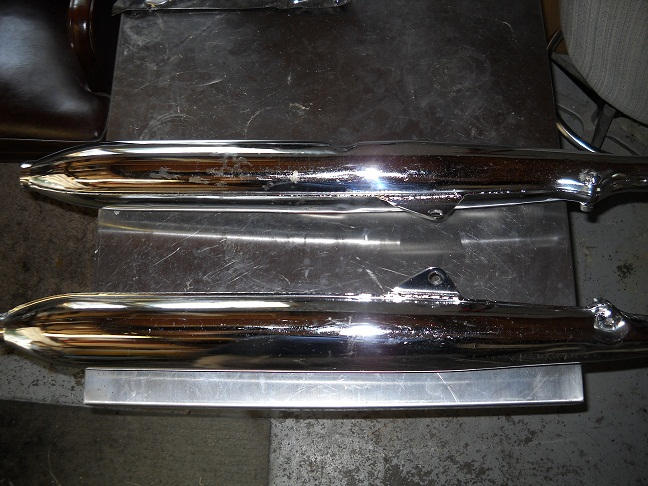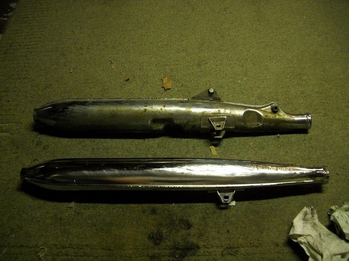 Thanks for the tip, conbs. I thought they were too far gone, but after an SOS pad and some orange pumice cleaner, they came out looking salvageable. Here's a before and after shot. Still have some work to do, but I'm sure it will be much cheaper than replacement. Any suggestions as to what to run through the inside to clean up any corrosion and carbon? Also, would it benefit me to replace the baffles inside the mufflers with new?