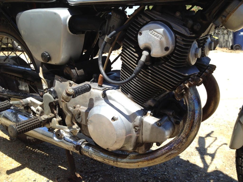 After many years, I'm about to finally get started on bringing back my 1966 CB77. She's a black 305 Super Hawk. I've owned her since 1971, and I took her off the road in 1975 when one cylinder went bad (18182 miles). She was my first motorcycle, and yes, I kept her all these years intending to get her running and on the road again. After sitting all that time, she's really rough, as expected. Some of the issues are: a bad cylinder (I don't know what's wrong - oil comes out from around the spark plug); broken speedometer glass; dented headlight bucket and bent headlight bezel; dent on the top of the gas tank; cracked and checked intake boots; rotted air filters; rusty rims; bad tires; rotted mufflers; etc, etc, etc. Despite all that, she's really not as bad as she sounds. The engine, except for the one cylinder, is sound, The transmission is (or was) good, the paint on the frame is good, the seat is good, the fenders are good (the front one was bobbed, but it's okay), the side panels are good, and most of the wiring and cables are good.