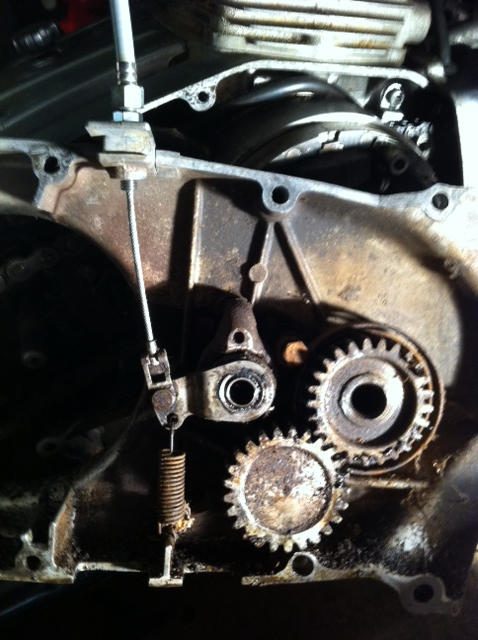 The cable comes out of the lever and takes a sharp down turn and goes under the tank on the same side as the lever and then down to the box.