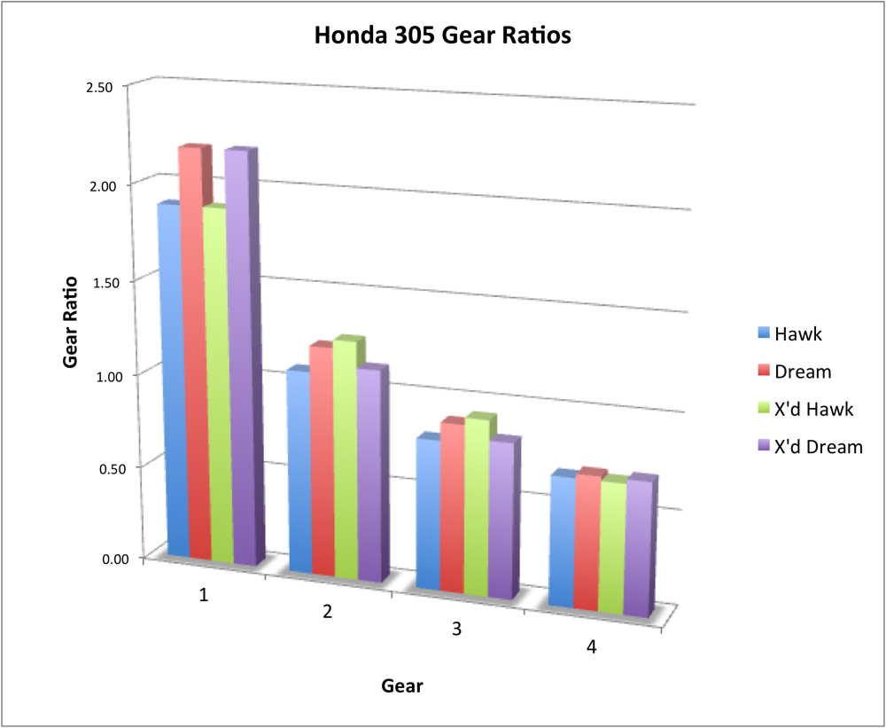 It's interesting (but not shown in the graph) that the Hawk and Dream have different pitch gears. The sum of the teeth on Hawk gear pairs is 52 while the sum on a Dream is 51. I have not checked but wonder if you can transfer gear pairs from bike to bike. i.e. could you use a Hawk first gear (pair) in a Dream.