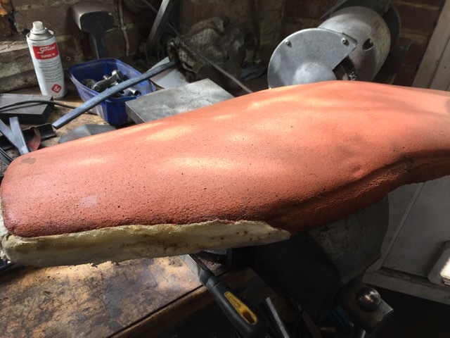 A couple more steps forward, a bit more chroming and the seat recovered. The seat base was the usual rusty mess with a tear  and some of the foam missing. I glued some foam salvaged from an old MX seat to the original foam and reprofiled it using an angle grinder and a sanding disc. I cleaned off the loose rust and treated the remainder with some rust remover before applying a few coats of paint. The recover was then a simple job of stretching it over the foam and base, luckily the spikes that retain the cover were mostly still useable.