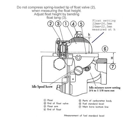 Check that the carb float height is set accurately and correctly – 26.5 mm for Keihin carbs.