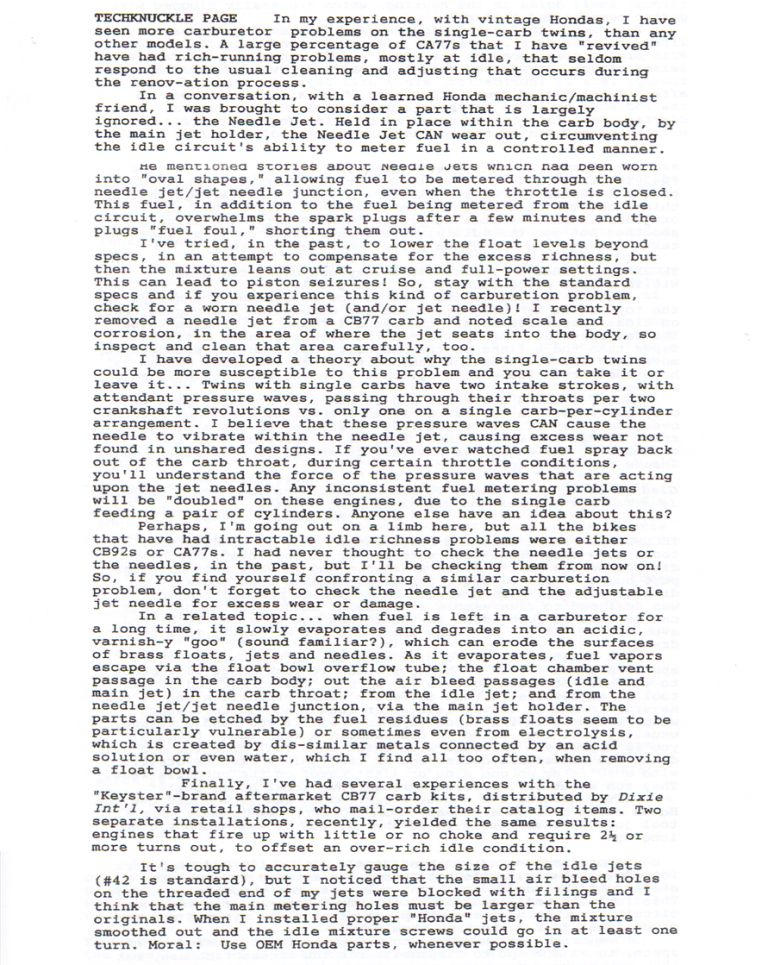 Sounds like you have Bill's Restoration Guide (HNRRG); take a look at his article starting at the bottom of p12 within the TECHKNUCKLE section; there's some really interesting philosophy and otherwised-missed info there for single carb bikes!
