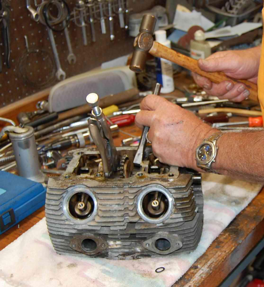 Ed pulled the camshaft and valves in nothing flat and after sandblasting and turning valves and other parts pronounced most of it good. Let me try and get this story straight: As Ed’s loosening up the cam locking nut that holds shafts together he says, “you know, (noted repair guide author) will tell you that this nut is always left hand thread, but here this one’s right hand thread. Only the second one I’ve seen like that.” Very interesting, little details like that