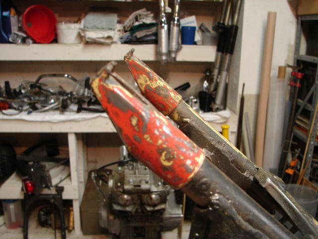 Frame is stripped and ready to go get blasted and powdercoated. Wheels look good, rims look good, Will probably source a racing style tank (any suggestions as to what will fit will be appreciated.) and a solo racing style seat.