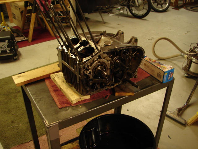 I have my Goldwing running and out of the basement. Serious work now commences. I pulled the head and cylinders tonight. I see that the head gasket is blown. Now I know why the po sold it to me ( aside from running into something fast enough to bend the forks.) I also have good bores and pistons and rings. Pistons are marked 0.75, so I can assume I'm on the last rebore. Glad to see they look pretty nice. Lots of odd nuts and hardware. Lower back corner of right side cover broken off ( not fatal). Did lose the sideplate from the master link in the engine even though I had the opening packed with paper towel. I was going to check everything inside anyway, right ? Everything that I can see inside looks good. Will try the grinding deal on the cam chain tensioner-its pretty hard. Will glass bead everything after its stripped and inspected.