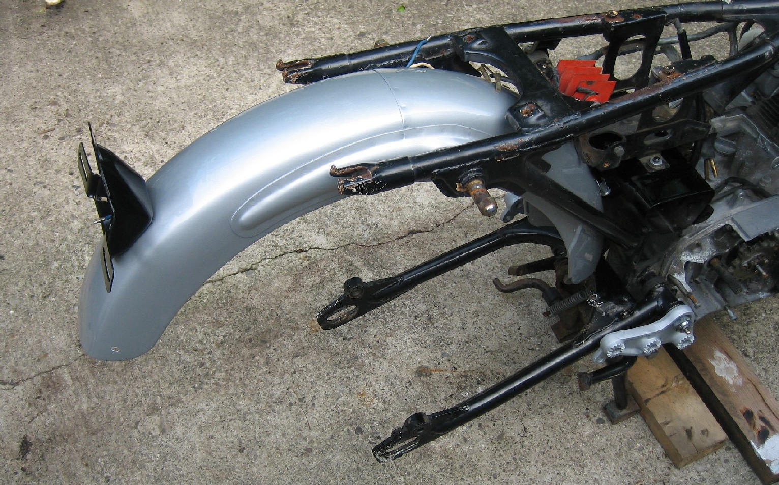 blasted the taillight bracket, straightened the license plate mounting areas, primed/painted. had to replace the old rubber wire grommet with a new one from ohio cycle.