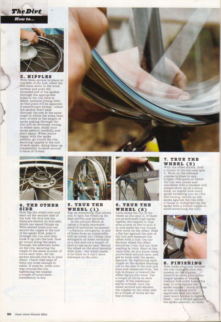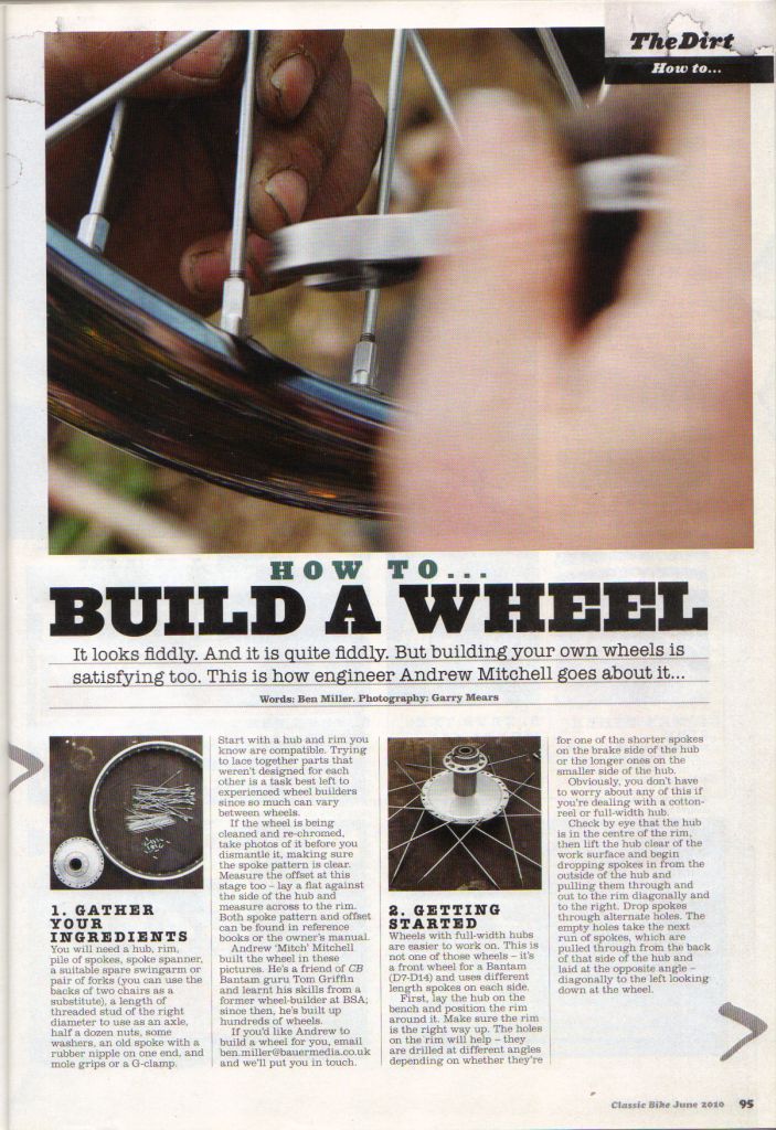 All great fun and very reversible. I started on my BSA Bantam many years ago and have been building my own wheels ever since.
