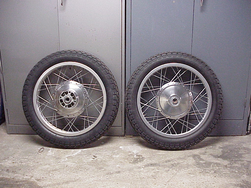 Never got around to putting the wheels on the bike. Had to replate the sproket nuts and bolts. But I did promise pics of the tires on the wheels. So here you go. You can just notice the added curl to the sidewall near the rim on the 3.25 mounted to that WM1 front rim.