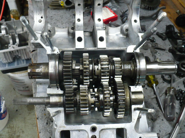 I next put in the trans. First put in the main shaft assy, lining up the fork with its gear and the bearings with their set rings. Next put in the counter shaft assy making sure to line up your bushings with the dowels. Don't let your bushing slide too much or you risk dumping your roller bearings.