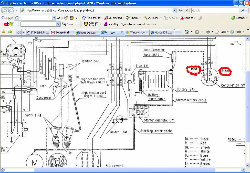 It looks like there's a black wire missing that goes into the headlamp. I'm not too familiar with the CL, but I believe, from the wiring diagram, that there's a black wire from term IG to the coils and another to the lighting switch in the headlamp (on the CL also?).