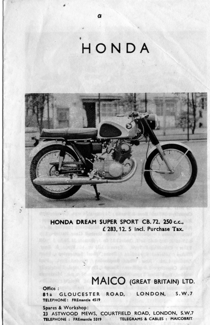 Going through my bike stuff today I came across this early Honda brochure. I hope I can get the pic scanned Ok. The brochure must be around 1960, and pre-dates Honda UK. The pic of the CB72 seems to show a pre production model (?), with a different tank, side panel arrangement, and footpegs. Were any of this spec ever sold?
