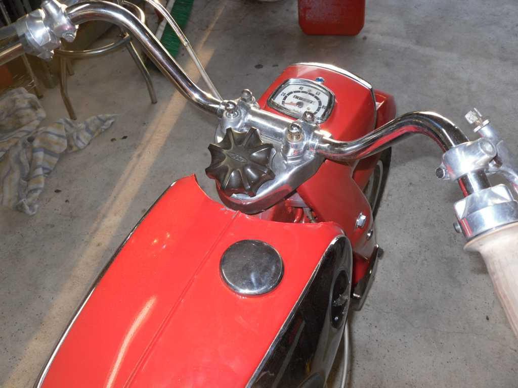 A few pics of a 1966 I am in the midst of making new. I have removed and polished most of the aluminum bits - Painted the front half (Coke-Cola Red) - repaired the speedometer - Added a new fuel shutoff - So far it seems to run okay - pulled the side cases on the motor and checked the oil filter, clutch and cleaned the starter. All bearing and brakes seem okay. Seat is out being upholstered.