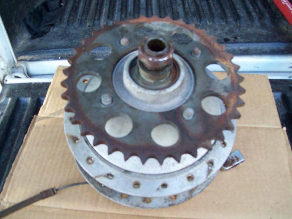 For sale - '63 CL72 rear brake hub, sprocket & axle. The brake lever is frozen but will loosen with work. Needs to have the brake pads glued back on. Includes the sprocket but the sprocket nuts are missing. $70.00 & shipping for all.