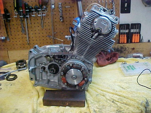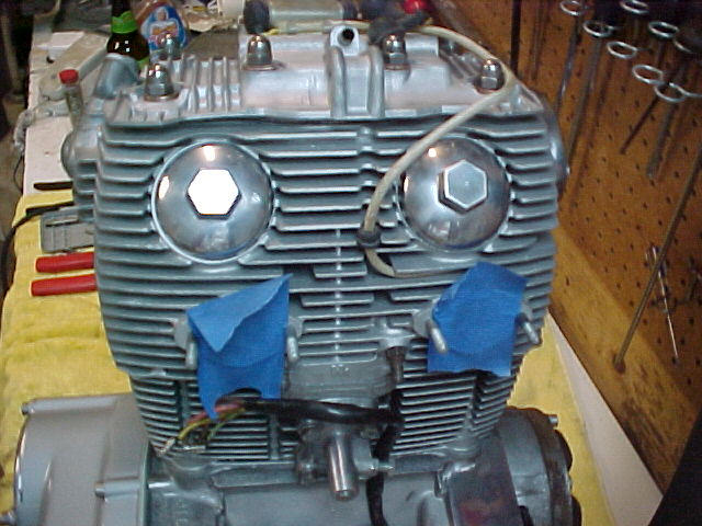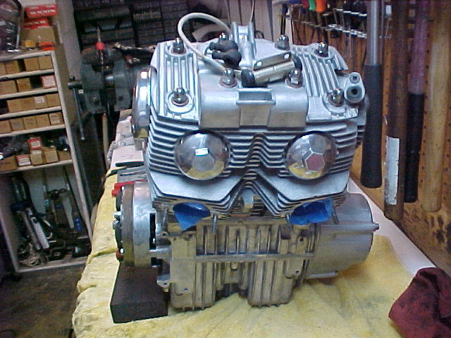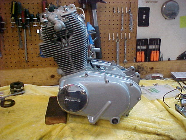 Here's some pics of the engine buttoned up. Hopefully we'll have a mock-up bike in a couple of weeks so we can fire her up. It really came out nice, with the graphic designer hounding me every step of the way! Deez has a great eye for detail, and didn't miss a thing! The list of new parts is quite long, and includes ...... cam chain, cam chain tensioner, cam chain wheel, Wiseco piston and ring kit, govener springs, points and condenser, stainless bolt kit, kick pawl pin and spring, clutch friction plates and springs, all new gaskets and seals, tappet covers, clutch lifter and thread, and surely some other items I'm forgetting! Gears have been X'ed, valves and seats cut, engine bored second over, cases bead blasted, covers either painted or polished. This is gonna be one slick Cafe' bike!