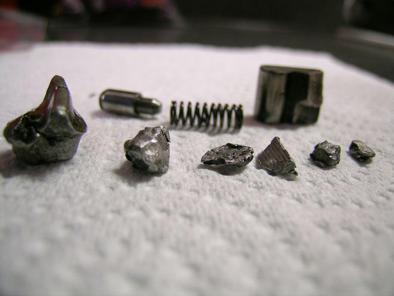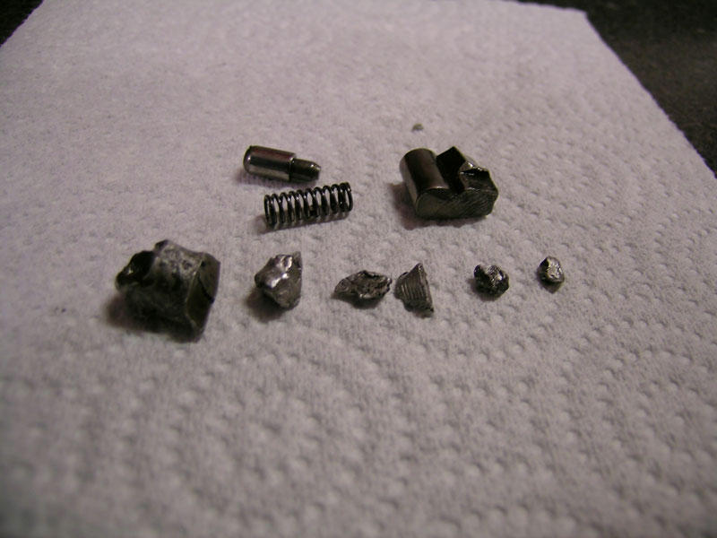 Pawl, pawl spring, pin, and six pieces of aluminum recovered from the crankcase.
