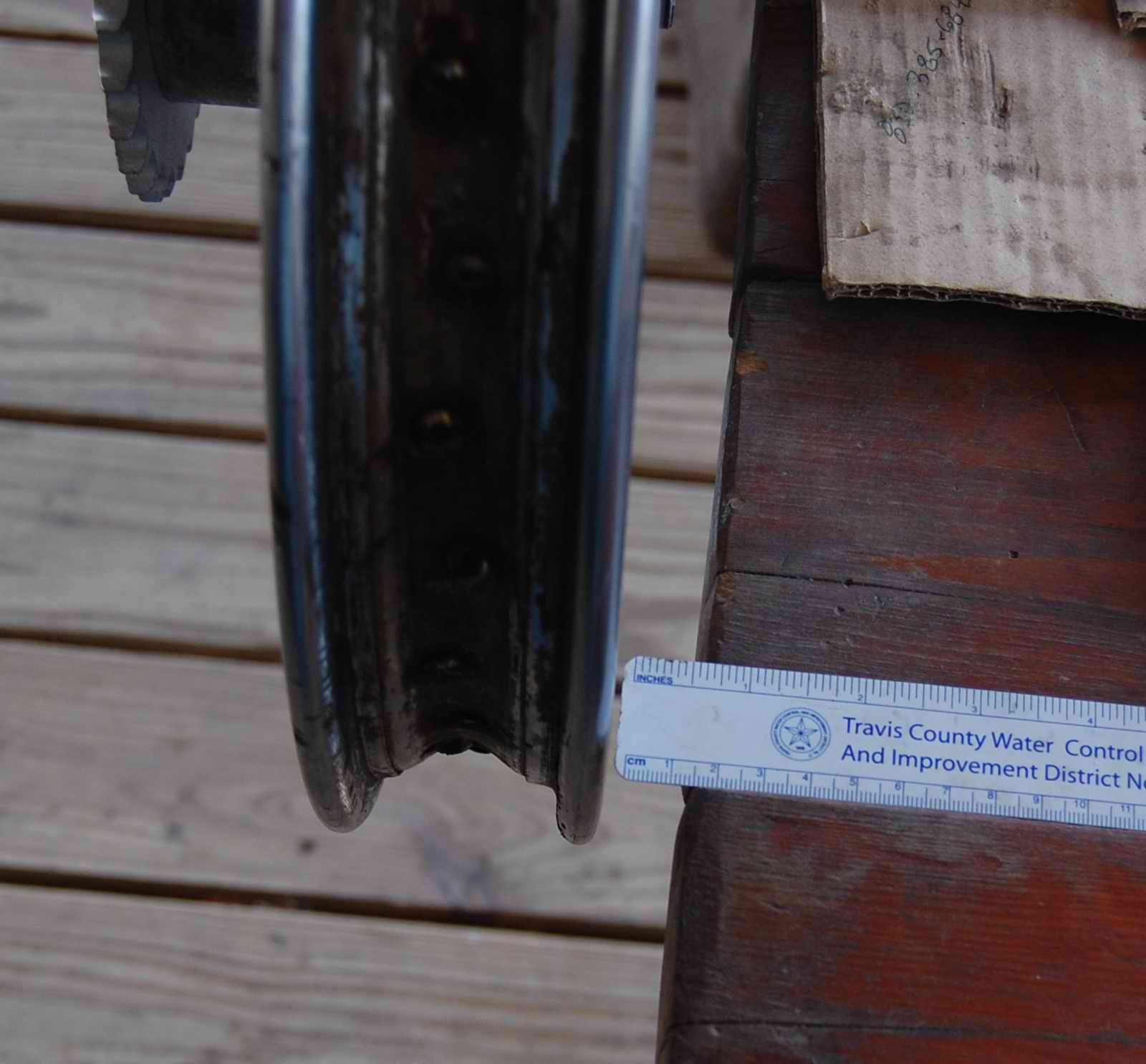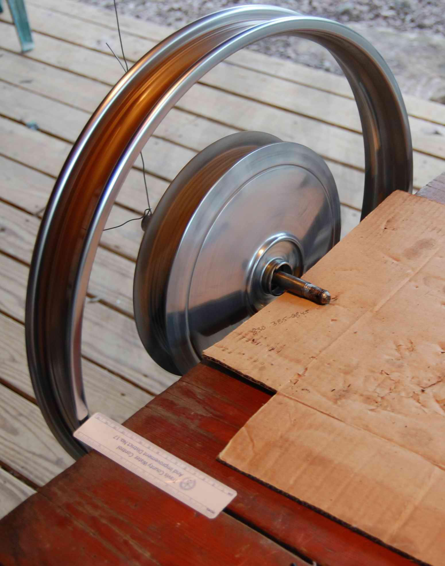 I’m working on getting wheels tuned up a bit so spokes don’t sound so much like a xylophone when dinked on. Tone deaf as I am, I’ve got ‘em all within an octave or so at this point, gonna try going around one more time. It’s frustrating, as tightening in any one place seems to change tension on all the other spokes as well. My jury rigged “truing stand” with one end of axle on table and other end flying from wire from ceiling reveals minimal runout and out-of-round (less than 2mm), which Ed says is just fine.