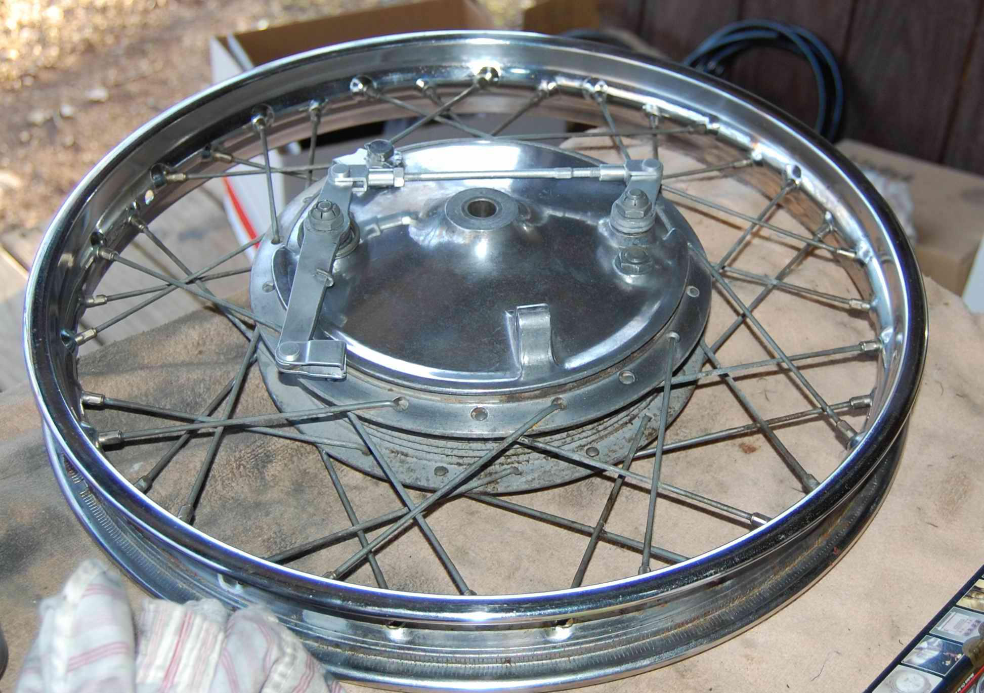 Brakes are rebuilt, hubs, rims and other shiny parts are shiny as they’re gonna get this time around. Ed’s suggestion of oily steel wool got about 80% of rust off rims, polishing with Autosol got most of the steel wool scratches out, so they look ok. Have to keep reminding myself this is a rider. Just have to park it with rust spots up.