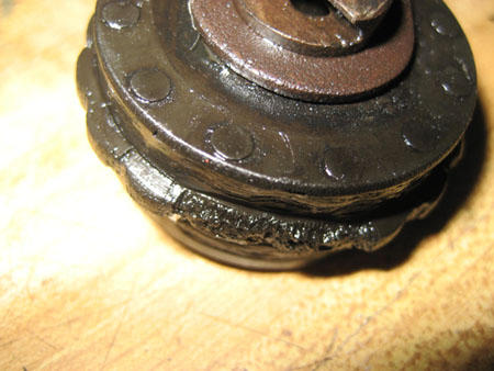 I lapped the valves, checked with solvent and they seal well. Cam's and lifters look good. The spocket on the cam was slightly loose on the center. I wire welded it carefully, being certain not to get it too hot. One problem I did notice on disassembling the head is that the lefthanded nut on the center assembly was loose. The cam adjuster wheel was shot and may have been a related problem. There is also a small amount of wear on both sides of the center rib on the large idler wheel. There is a line on the wheel that goes across it (see attached picture.) Is this normal? It doesn't appear to be damage.