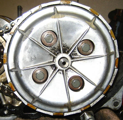Light groove in left cover where it appears clutch had rubbed. I'm not sure what's going on there. The clutch cover has been ground off at the outer circumference at each rib.