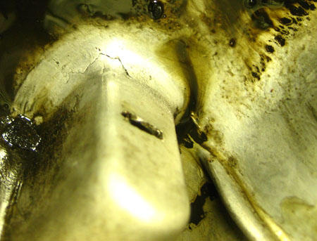A possible crack inside the case on the left side under the rear shaft. I don't think it's a problem, but I've been wrong once or twice. Okay, according to my wife, many times.