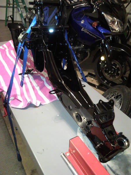 Oh, and I did strap the frame down so it couldn't hop off the table... see below.