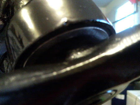 One thing I did notice was a tiny groove cut in the outer (top) edge of the bearing race. The same groove showed up on the top and bottom race so I'm thinking it was something done either intentionally or unintentionally during manufacturing. It's far too fine to have been made from wear (and there's nothing that I can see from the parts that would cause it). I'd love to know if it was a defect from some manufacturing process or by design. ?