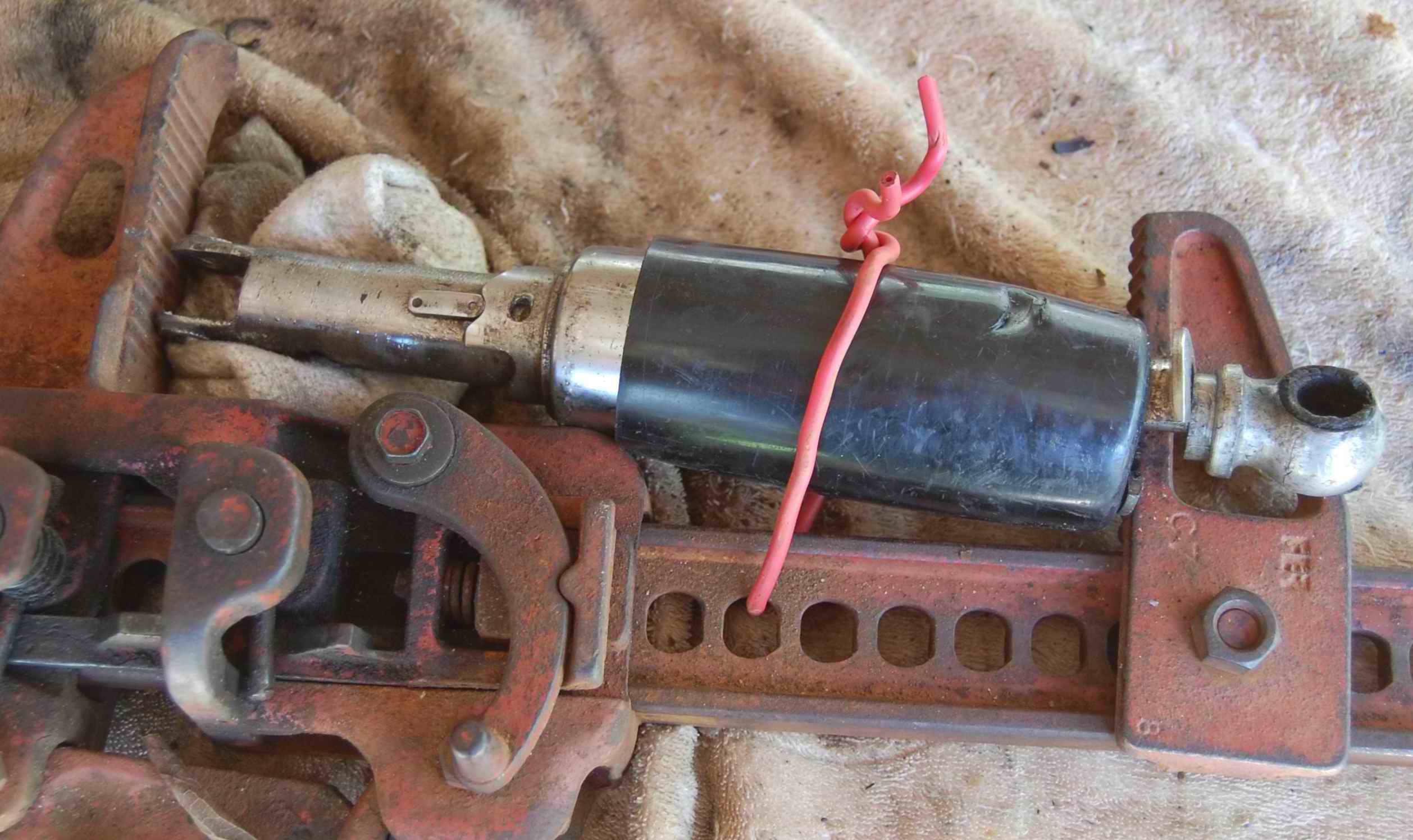here's how I got my old shocks apart, may give you some ideas. Somebody said they used a Work-Mate bench to do the same thing, others have done it with a variety of other tools and techniques. I used a lot more padding and care to get the new ones back together. good luck, Lee