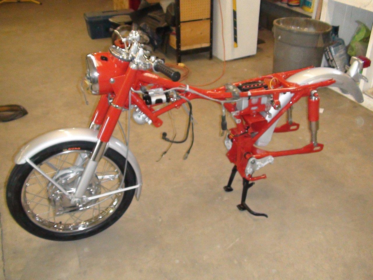 Finally got almost all my pieces. Enough to get started putting everything back together. I bored the cylinders and put in new pistons and rings, new valves, all new seals, replaced any bearings that needed it, shimmed the tranny, rebuilt the carbs, new points, cam chain and roller, all new sprockets and chain, new tubes and tires, wheel bearings, cables, new repro mufflers, and everything that can be painted or polished has been. The pictures are off a little colorwise, as I din't have the white balance set properly. The red is a fire engine red, but it looks a little orangey under the flourescent lights. I'm just waiting until I can get a hand to install the engine. The last thing I want to do is drop it at this point!