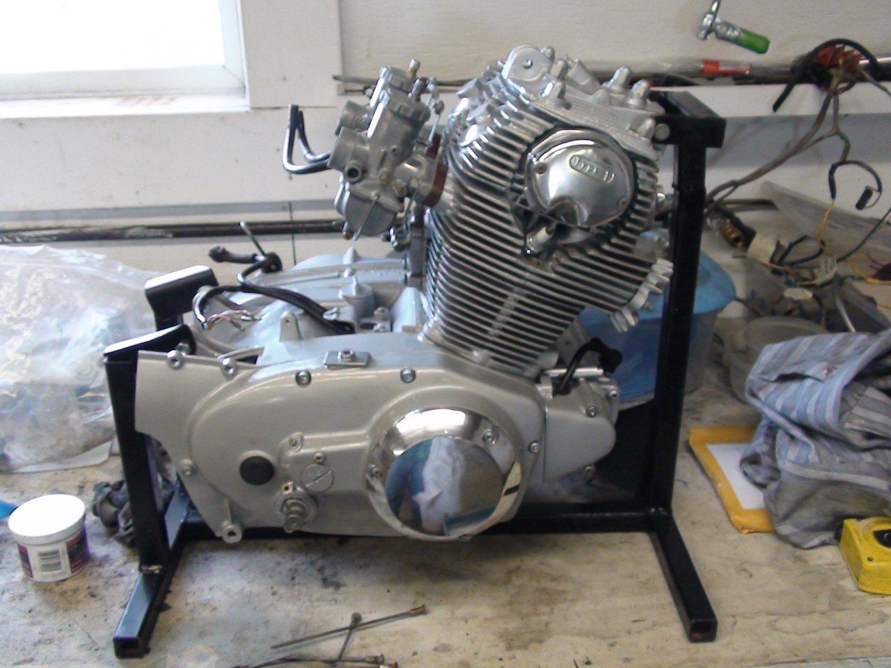 Anyways, the fenders and side panels should be getting back from the painters soon, and I will have the gas tank and frame ready for paint as well. I had the cylinders and transmission cases soda blasted to clean them up. I was hoping to leave them bare, but the aluminum was stained in spots, so I painted them with VHT flat aluminum. Looks good!