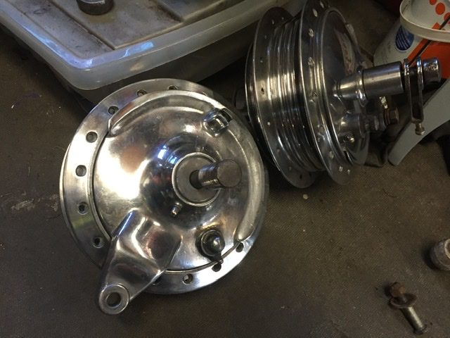 I had time this weekend to do a bit more on the little Honda. The wheels were next, as the rims were beyond saving I cut the spokes using my angle grinder and then spun the hubs up on the lathe. This removed most of the corrosion but the brake plates will need some more aggressive work to remove the deep pitting before final polishing. Shame the supplier sent the wrong rims or else I could have built the wheels up.