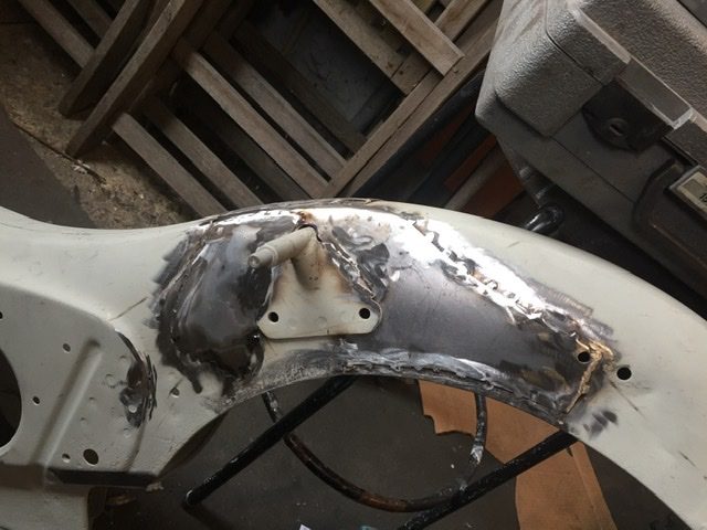 Made a start on cutting out the rust and welding in some fresh metal on the front mudguard. All the problems stem from the double skinned areas getting water between the layers of metal. I was able cut the outer layer away leaving the thicker metal in place and then tack the repair metal in place. While I was at it I took the opportunity to weld up the number plate mounting holes before grinding off the surplus weld and a skim of filler.