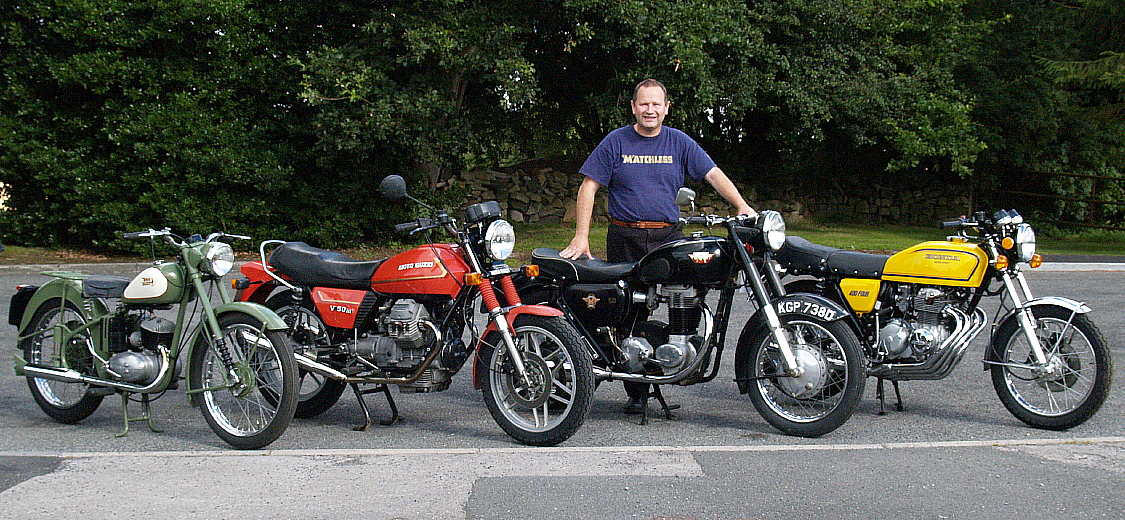 '65 CA95, in black; '68 Suzuki T20 Super Six, in met blue; '73 T500 Cobra, in red; '74 GT550, in blue & green. I wouldn't swap my CB77 for any of them, though!
