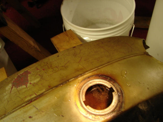 For lack of anything better to do (till payday when I can order some tranny parts) I got my spare tank out -shook it for a while with a handful of short chain lengths inside, and set it up with the milkstone remover. I have had good results with this before. I may have to do this twice this time. I dont know how much crap I loosened up. Anyway, here's a picture of my setup. Pretty basic. Plug the petcock hole with a cork, and put a lenght of fuel line on the crossover, then bend it double to kink it and give it a couple of wraps with wire to keep in kinked. Wont leak.