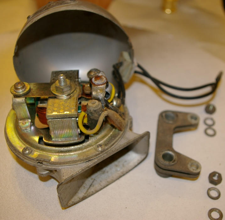 I wanted to take the horn apart for painting, to get a look at the electrics inside and to blow out the spider nest in the horn. A bit of sandpaper renewed the points and aside from cleaning, the rest of the guts looked fine and the horn worked at the outset anyway. The hardware is destined for the plating bucket.