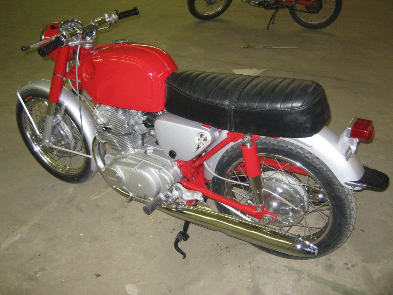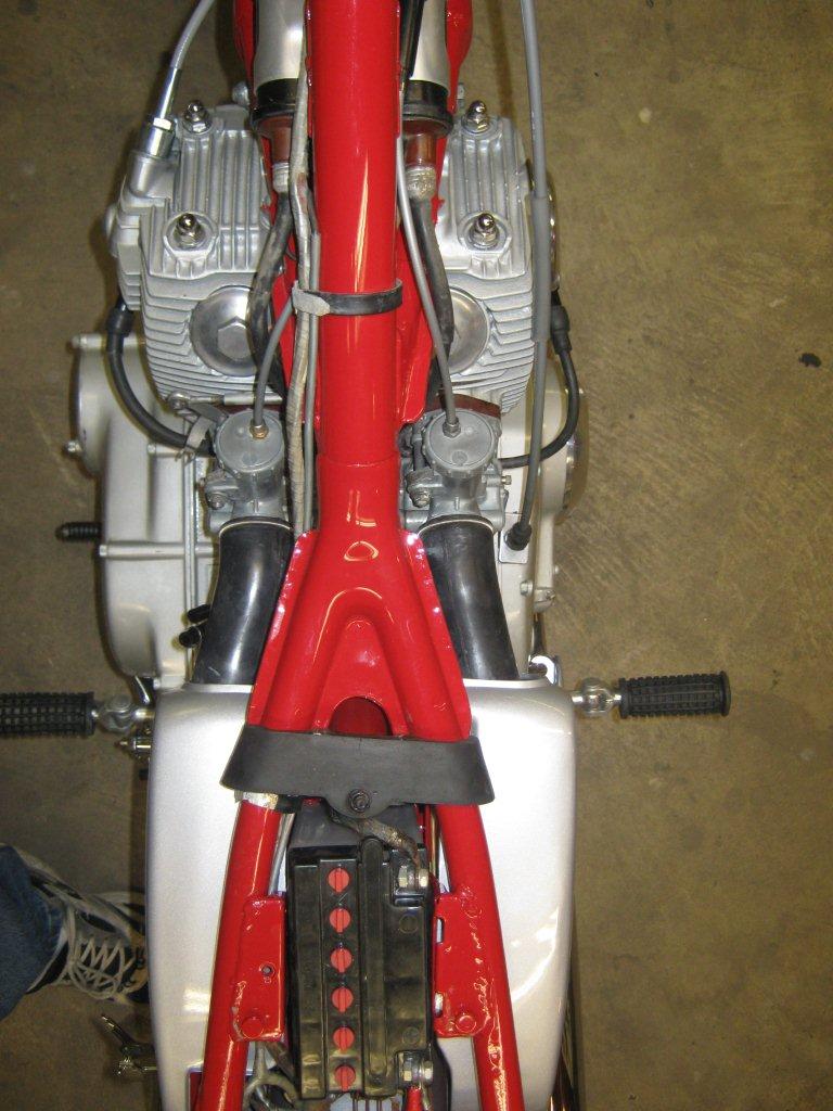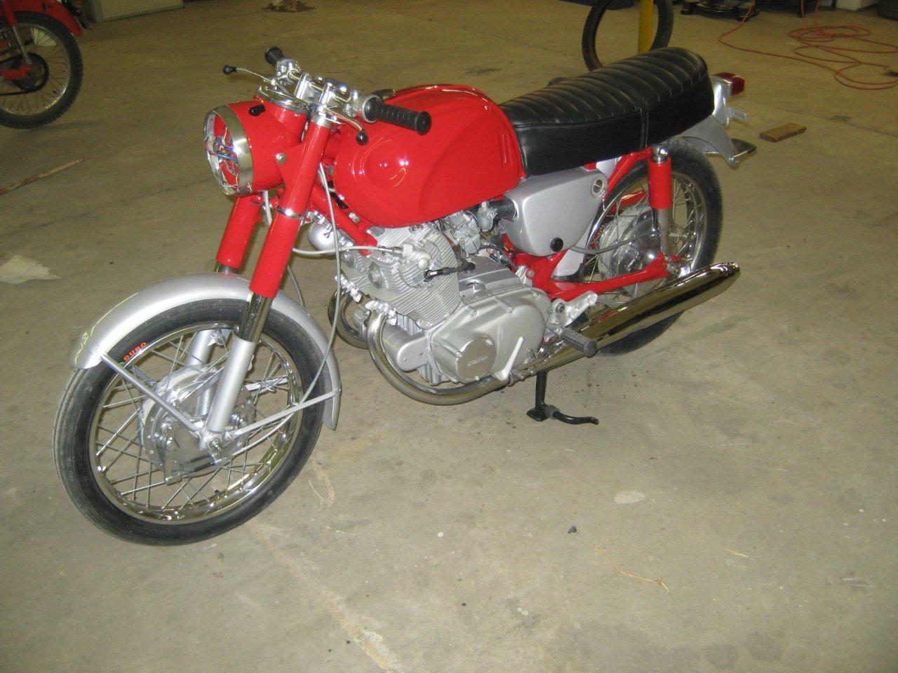 clhiller wrote:Finally got almost all my pieces. Enough to get started putting everything back together. I bored the cylinders and put in new pistons and rings, new valves, all new seals, replaced any bearings that needed it, shimmed the tranny, rebuilt the carbs, new points, cam chain and roller, all new sprockets and chain, new tubes and tires, wheel bearings, cables, new repro mufflers, and everything that can be painted or polished has been. The pictures are off a little colorwise, as I din't have the white balance set properly. The red is a fire engine red, but it looks a little orangey under the flourescent lights. I'm just waiting until I can get a hand to install the engine. The last thing I want to do is drop it at this point!