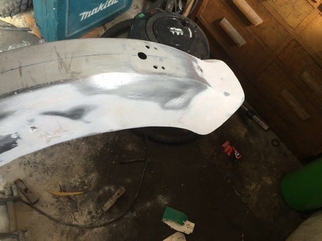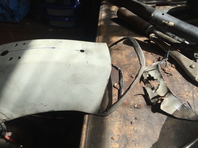 The inner sections were fabricated and tacked in place, these I could do in one piece so will help with the strength.I decided against trying to put a rolled edge on the inner panels like the originals as that is what trapped the mud and started the corrosion in the first place. I’ll also spray some under seal under the mudguard to hopefully prevent any more rust in the future. I tried the cast aluminium sections on and they sit fine and there were no more problems with the mudguard alignment even once the seam welding was done. One of the fiddliest bits to do was the wedge shaped section right on the end of the mudguard, it has two ridges and curves in three directions so a rough approximation was tacked in place and with some gentle tapping as I went persuaded it to conform, a smear of filler helped.