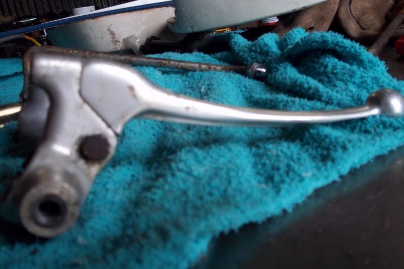 update, got the bike home to the uk yesterday, after its long drive, first thing i wanted to do was get the handle bar grips off, they are in very good condition, just soaked the left one in hot water, it came off a treat, took the tank off to have a look at the tag on the wiring, it was blank no writing at all on it. the right lever is different to what i thought it might be, any one have any ideas on that, it missing the left one.