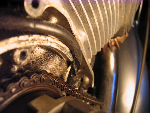 I also see that the insulation around the starting motor cable has been scraped away...perhaps this can be seen in the attached photo. I don't know what could cause this other than the starter chain, but it doesn't seem possible that there would be enough chain lash for it to reach that high. Perhaps this is something that occurred in the past because the cable slipped down closer to the chain at some point.