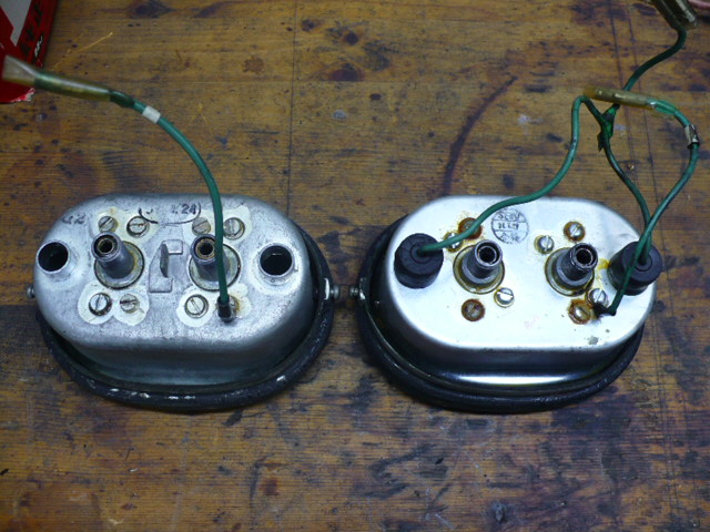 Here are 2 1962 speedo assys. The one on the left is from 1962 frame 21905. The one on the right is from frame 24182, which is the one I am currently restoring. What difference do you note? The earlier one doesn't have NIPPON SEIKI on the bottom. Now, look at the bottom. What surprised me is it is the 1st issue or at least 1st issue case as it has the clip for the spring holder seen on the earliest bikes. The other thing I thought was neat was the splice on the green dash light wires is taped, not plastic sleeved like on later issue units.