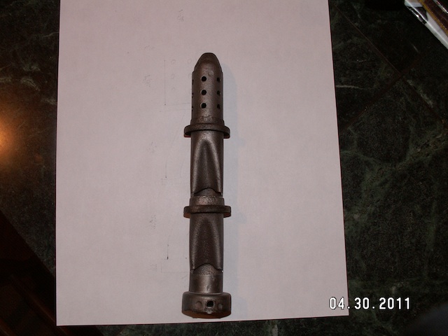 Wow, that was quick. And nicely done, too, George. A few more questions. How many holes in the cylindrical part and the conical end cap? I'm gonna guess 15 holes in the cylindrical part because they don't look diametrically opposed, and 3 in the cap. Also what diameter are the holes?geosar wrote:Here is a rough drawing with some numbers. You are correct, the wire is for twisting it out of the pipe. There is also a threaded hole in the rear flange to accommodate a small, chrome bolt. That is a 7 inch ruler at the bottom.