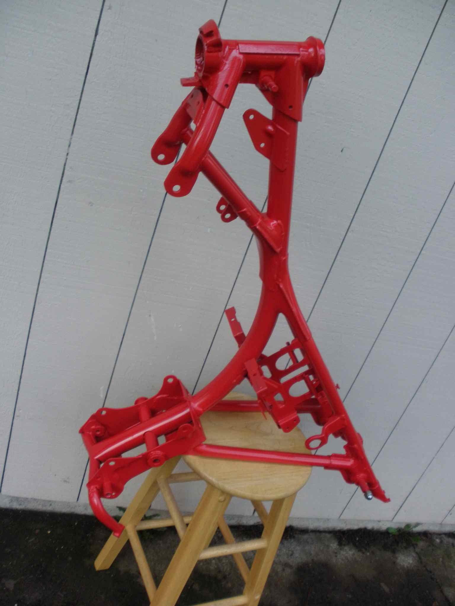 Frame, swing arm and most of the chassis is painted waiting on fork seals to assemble the front end and will then put it up on blocks with my new Hagons and start with the wiring harness. Wheels are going to be last.. .those hours of wet sanding and polishing...... .not looking forward to it. I have a new spoke set and I'm looking for alloy rims, anyone have a suggestion?