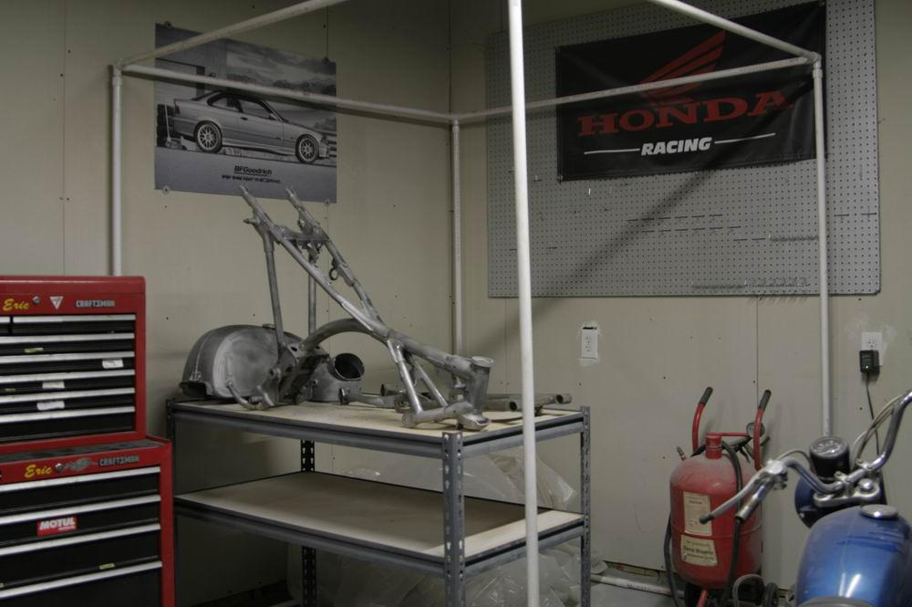 12/01: Here is a shot of my sandblasting/paint booth. I just tape up some plastic and its all set. I use a 40 lb pressurized blaster.