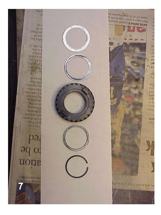 8. Photo 7 shows the internal parts in the order of assembly, from top to bottom. From the top, install the shims, then the drive gear with the lugs facing out, then the thrust washer and lastly the snap ring.